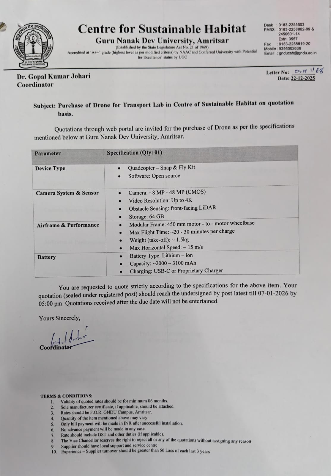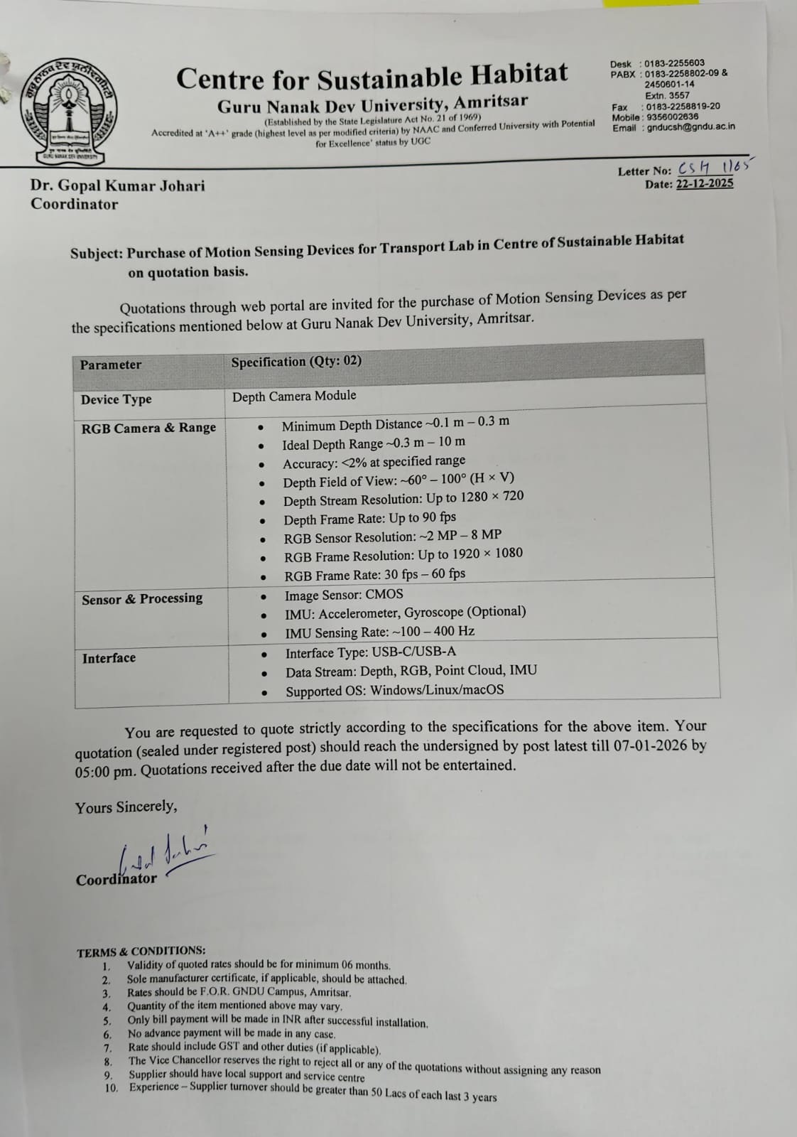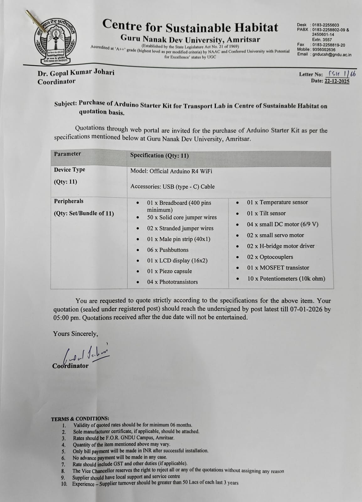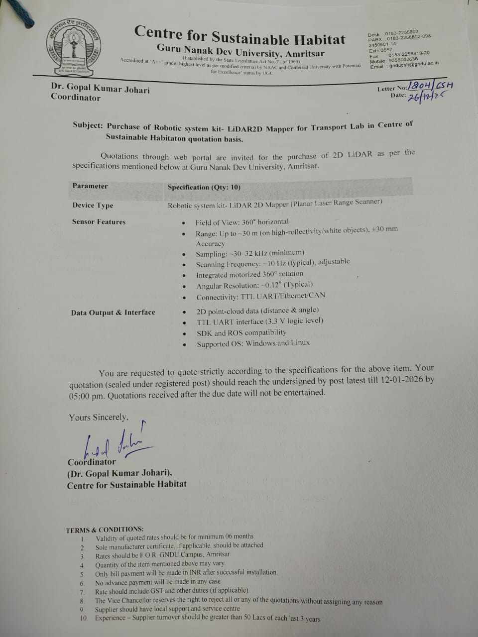 | Sealed quotations are invited for the purchase of Robotic System Kit in the Centre of Sustainable Habitat,Guru Nanak Dev University, Amritsar. |
