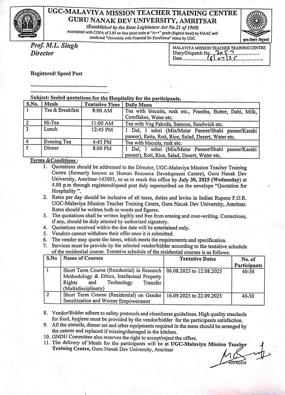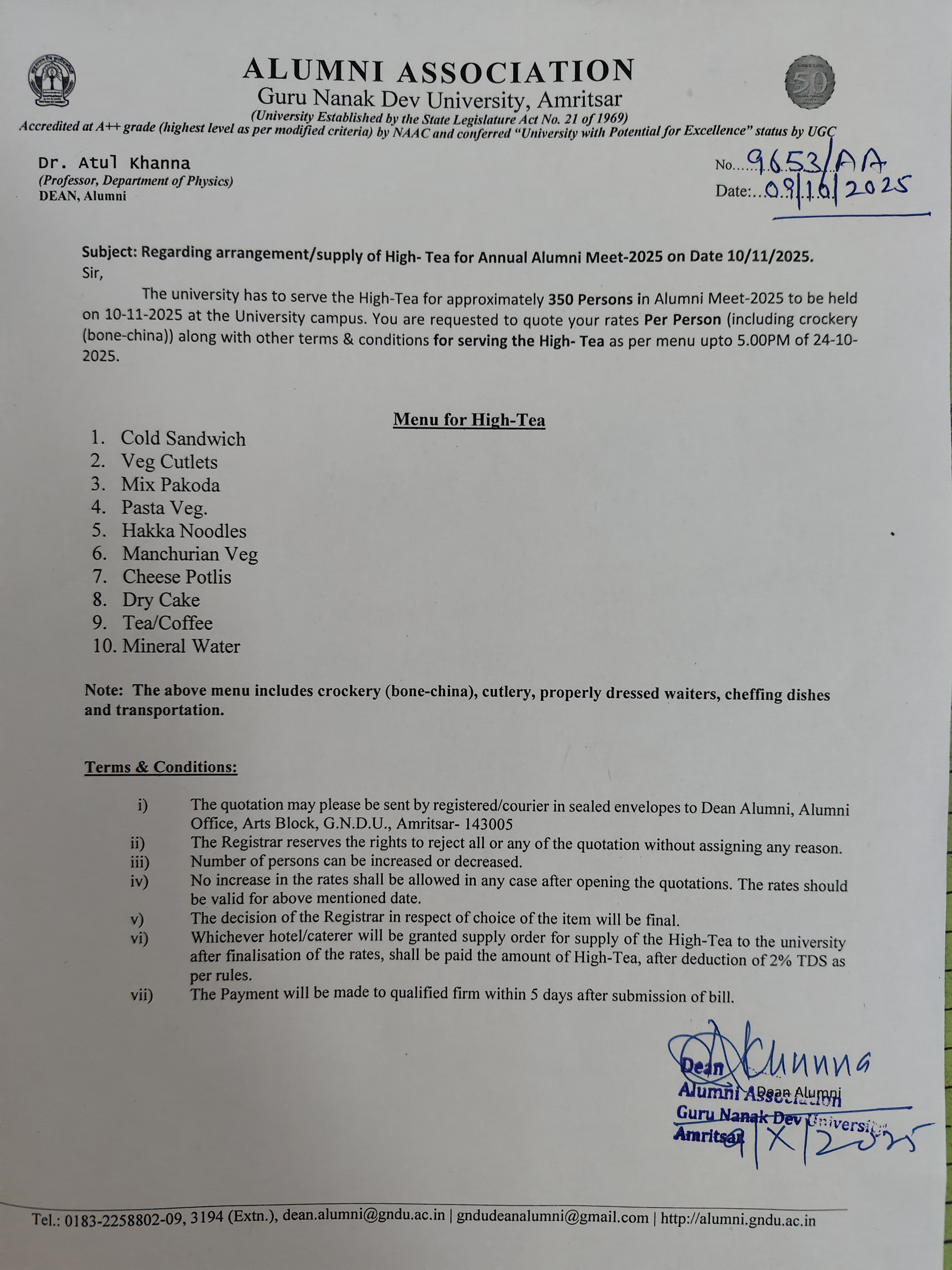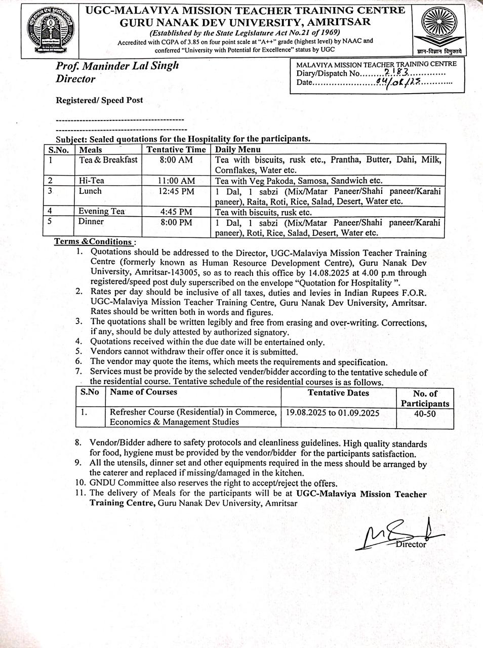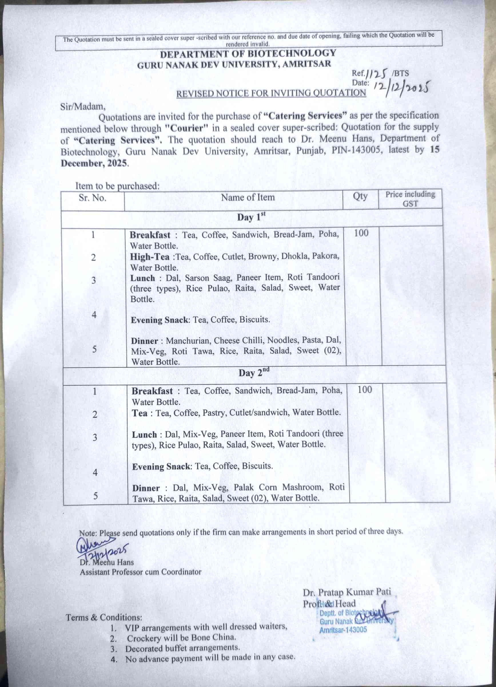 Sealed quotations are invited for the Catering Services in the Department of Microbiology, Guru Nanak Dev University, Amritsar. |