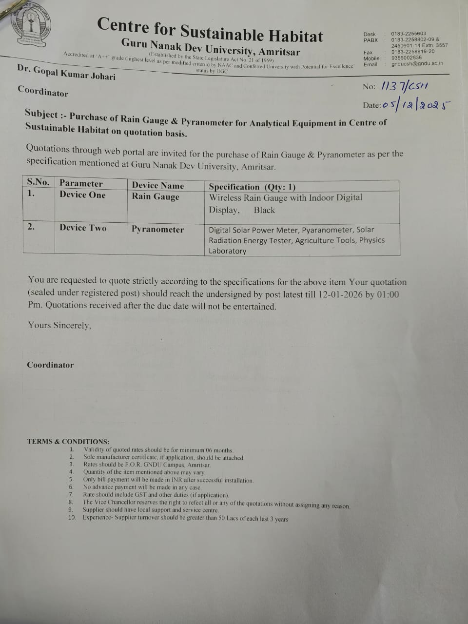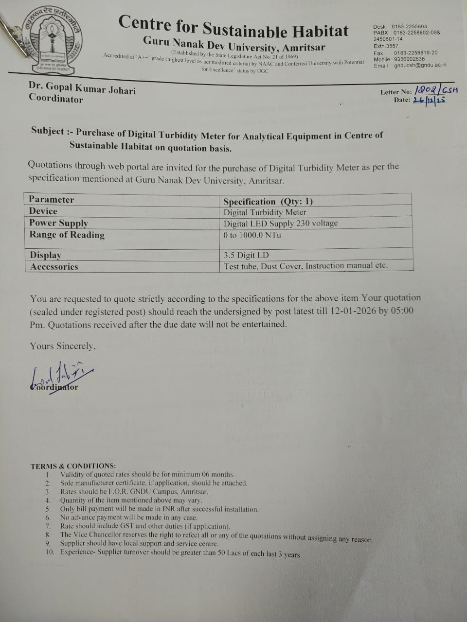 | Sealed quotations are invited for the purchase of Digital Turbidity Meter in the Centre of Sustainable Habitat,Guru Nanak Dev University, Amritsar. |