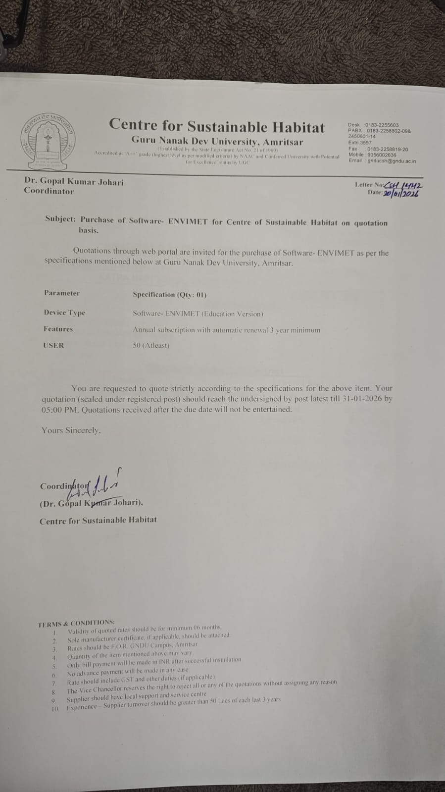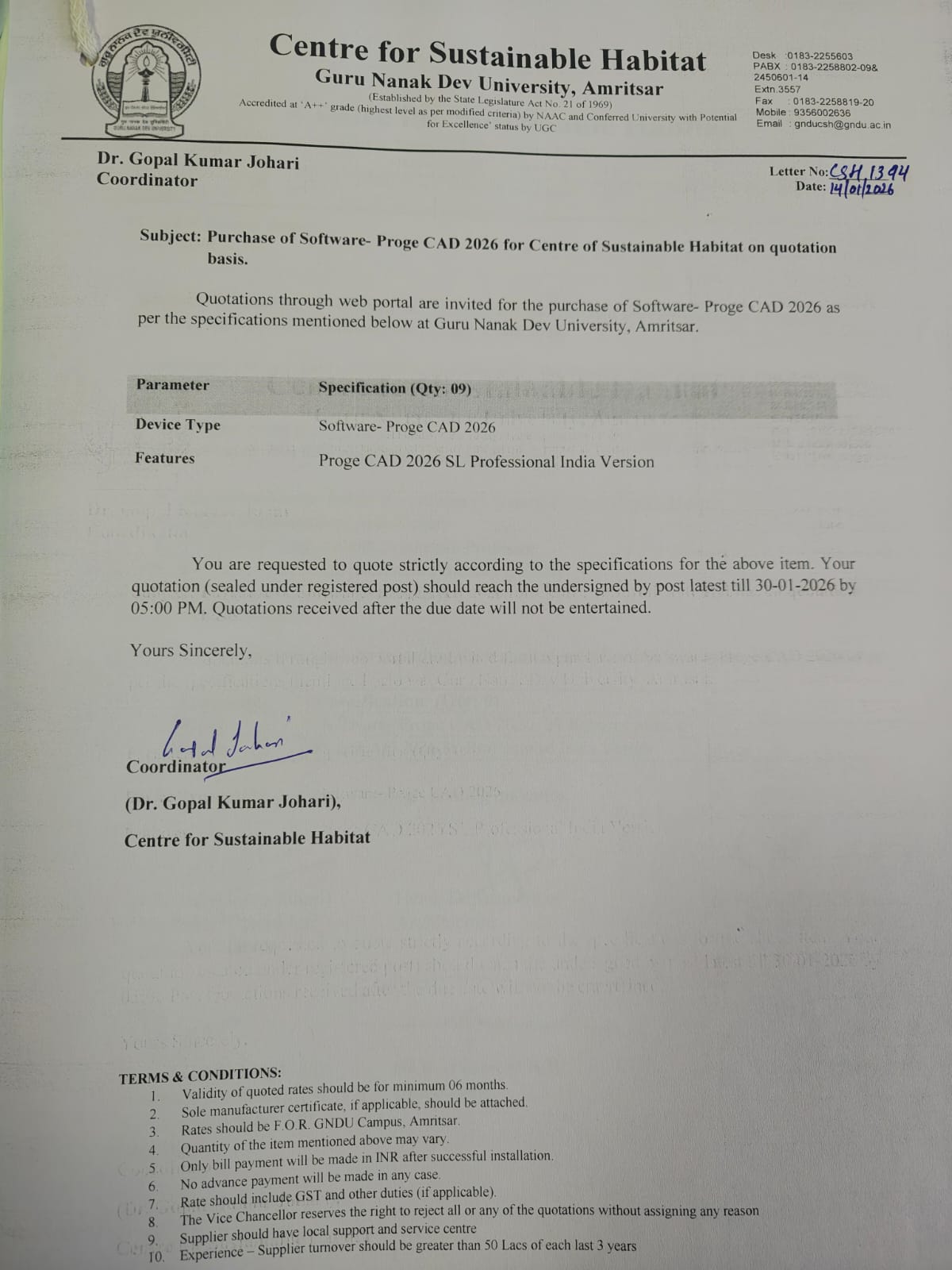 Sealed quotations are invited for the purchase of Software-Proge CAD 2026 in the Centre of Sustainable Habitat, GNDU, Amritsar. |