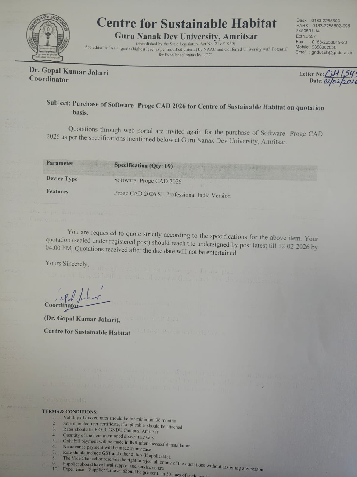 Sealed Quotation are invited for purchase of Software Proge CAD 2026 in the Centre for Sustainable Habitat, GNDU, Amritsar . |