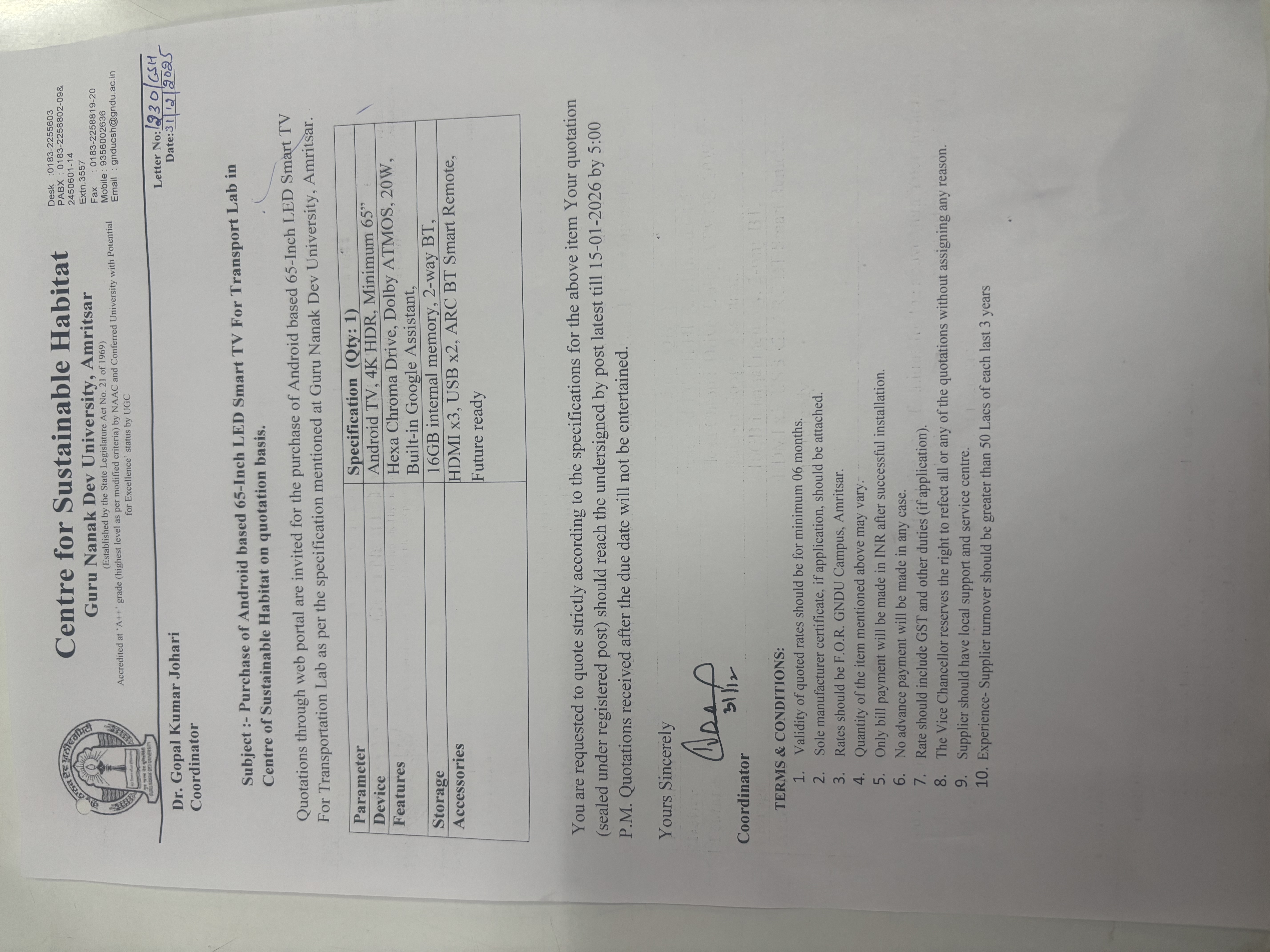 | Sealed quotations are invited for the purchase of Android Based 65 inch LED Smart TV in the Centre of Sustainable Habitat,Guru Nanak Dev University, Amritsar. |