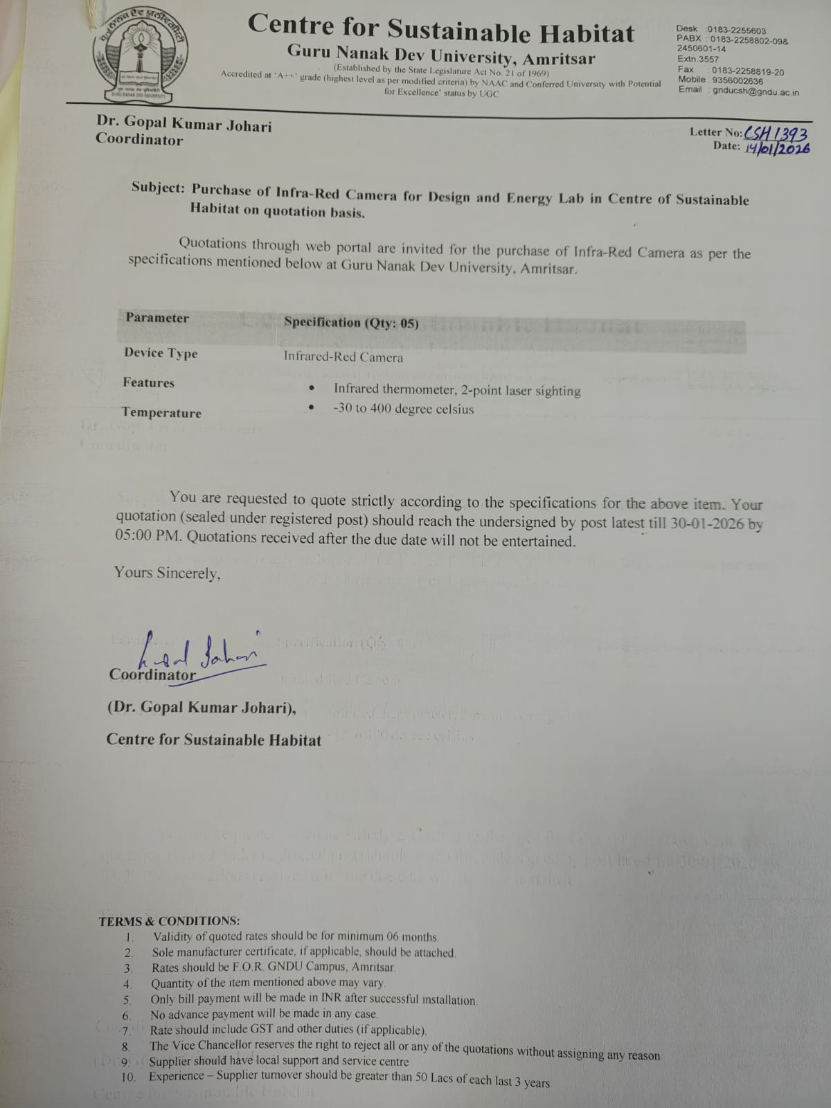 Sealed quotations are invited for the purchase of Infra-Red Camera in the Centre of Sustainable Habitat, GNDU, Amritsar. |