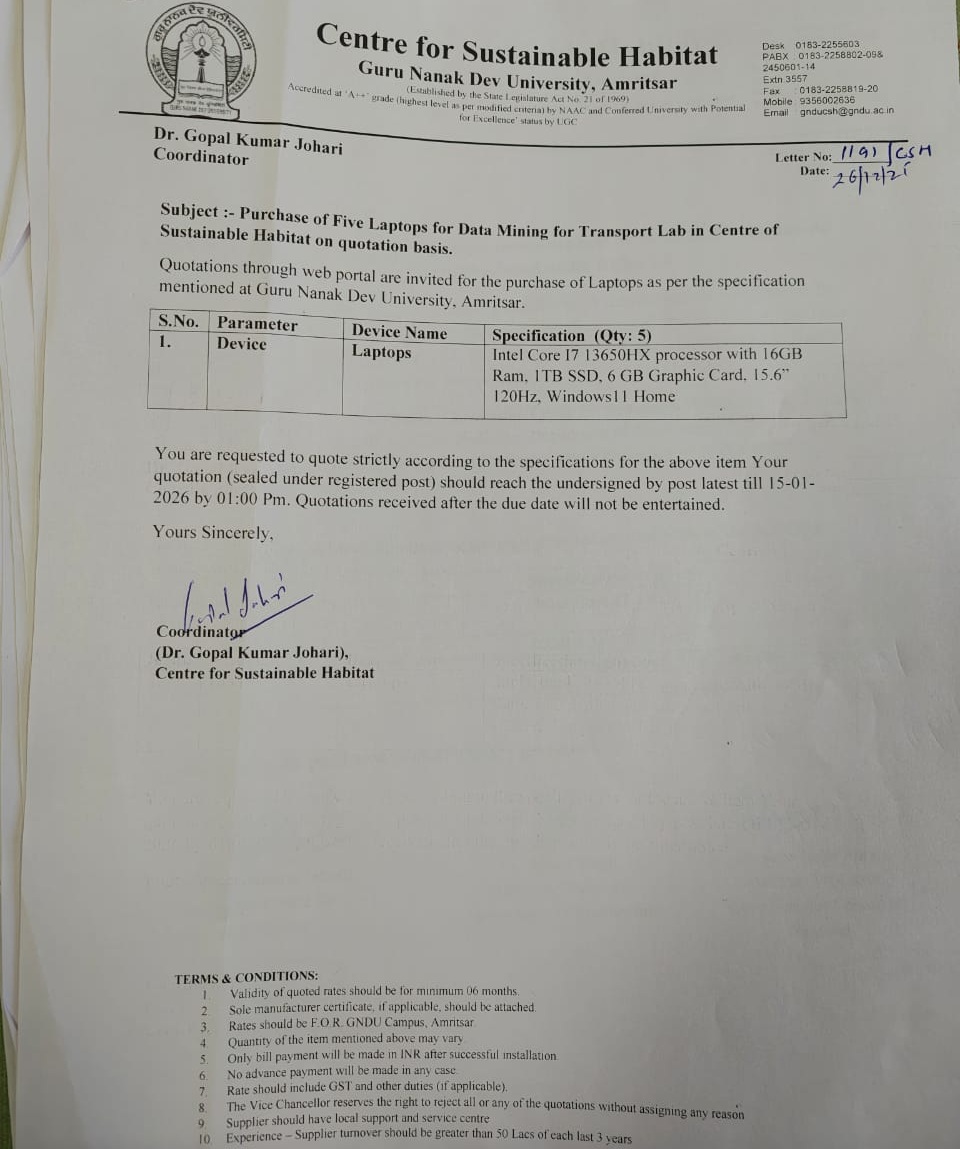 | Sealed quotations are invited for the purchase of 5 Laptop for Data Mining in the Centre of Sustainable Habitat,Guru Nanak Dev University, Amritsar. |