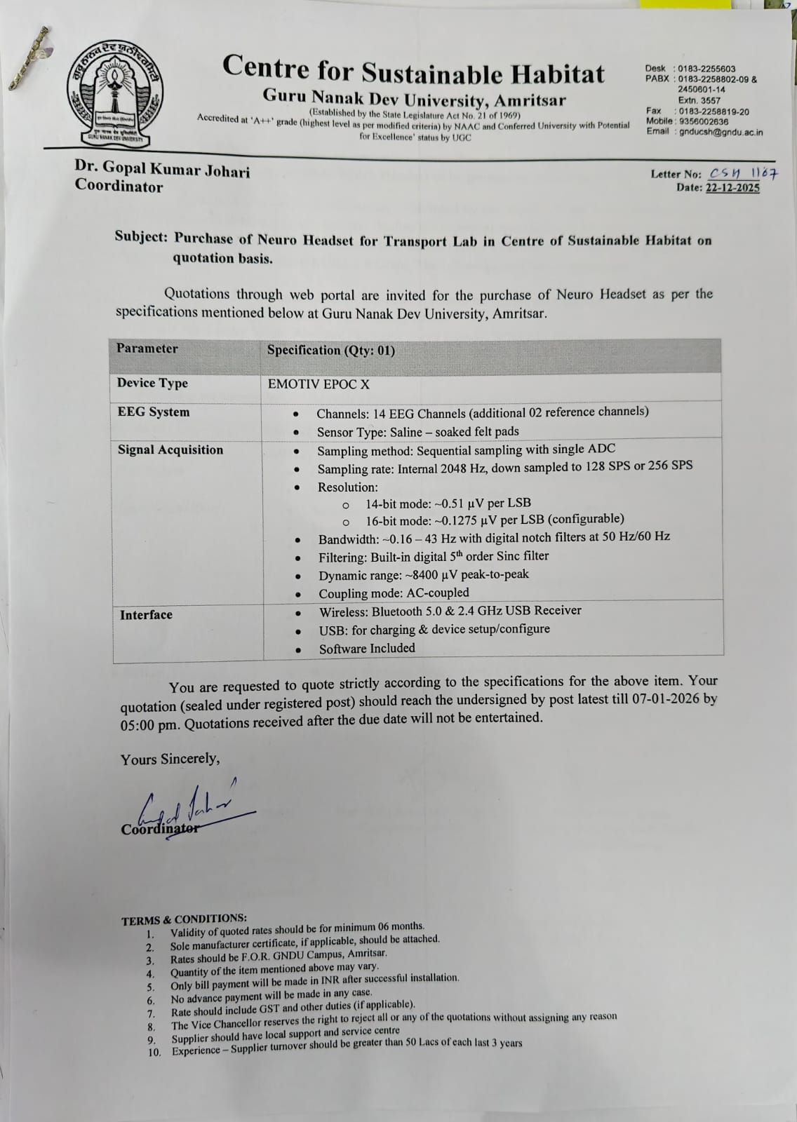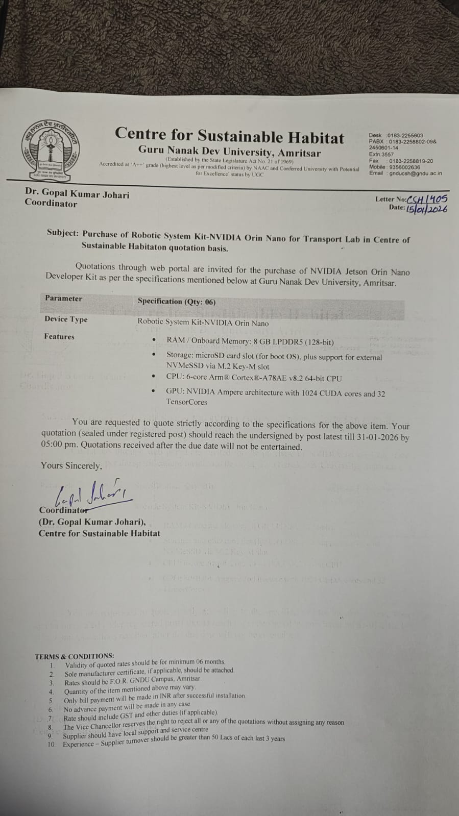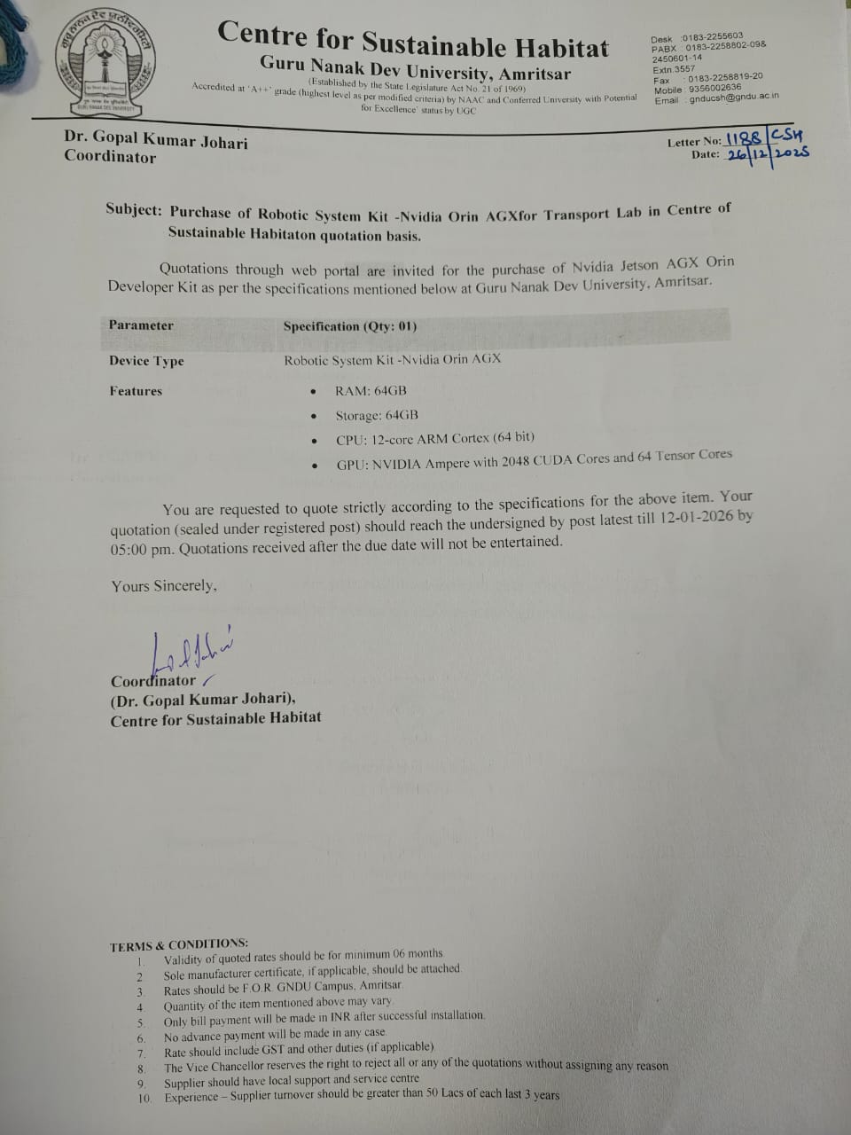 | Sealed quotations are invited for the purchase of Robotic System Kit - NVIDIA Jetson Thor Development Board in the Centre of Sustainable Habitat,Guru Nanak Dev University, Amritsar. |