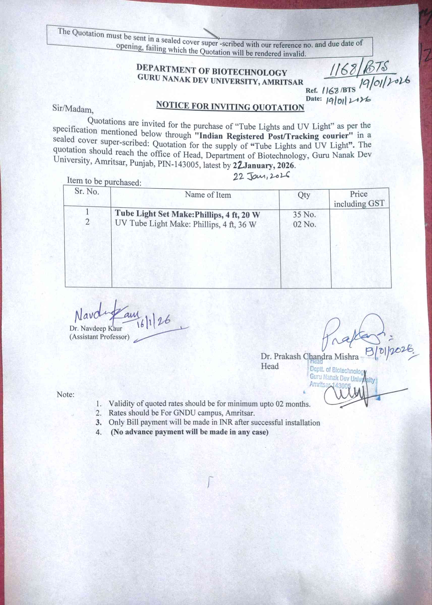 Sealed quotations are invited for the purchase of Tube lights and UV Tube in the Deptt. of Biotechnology, GNDU, Amritsar. |