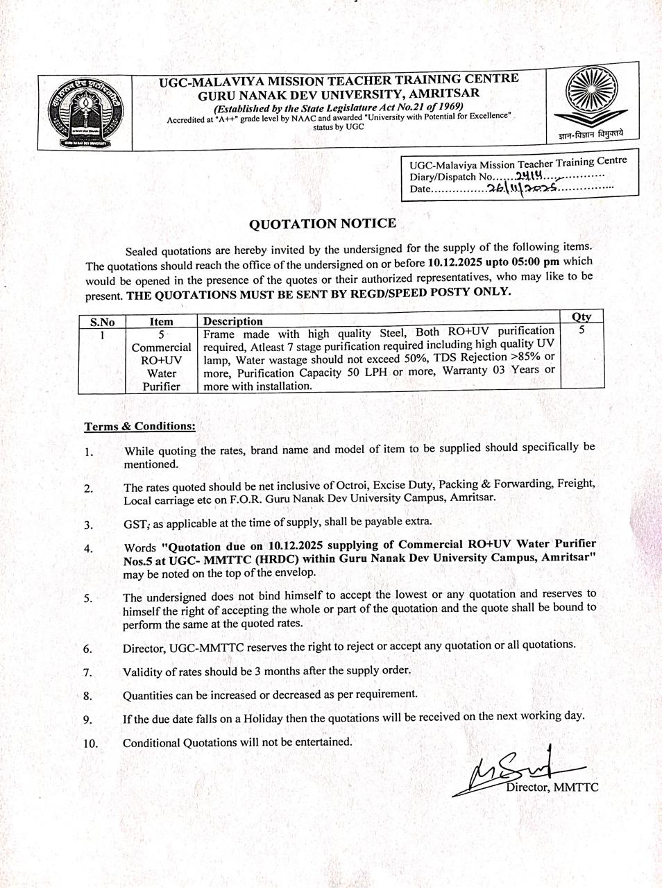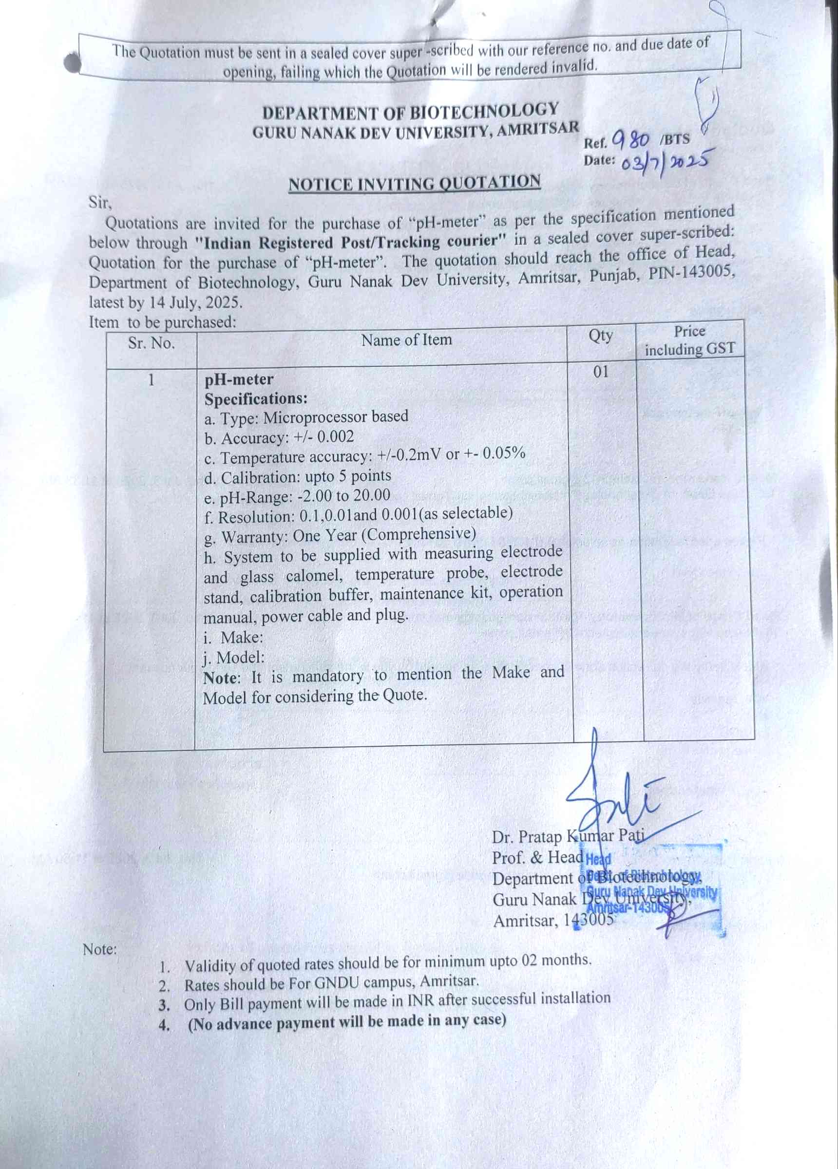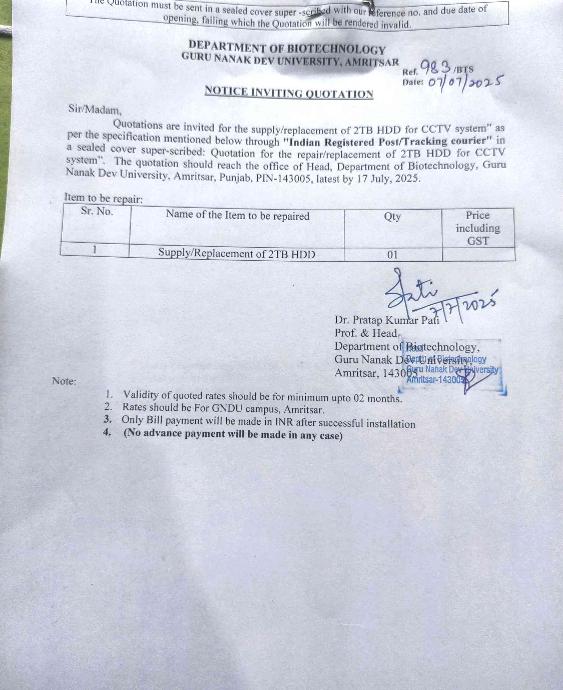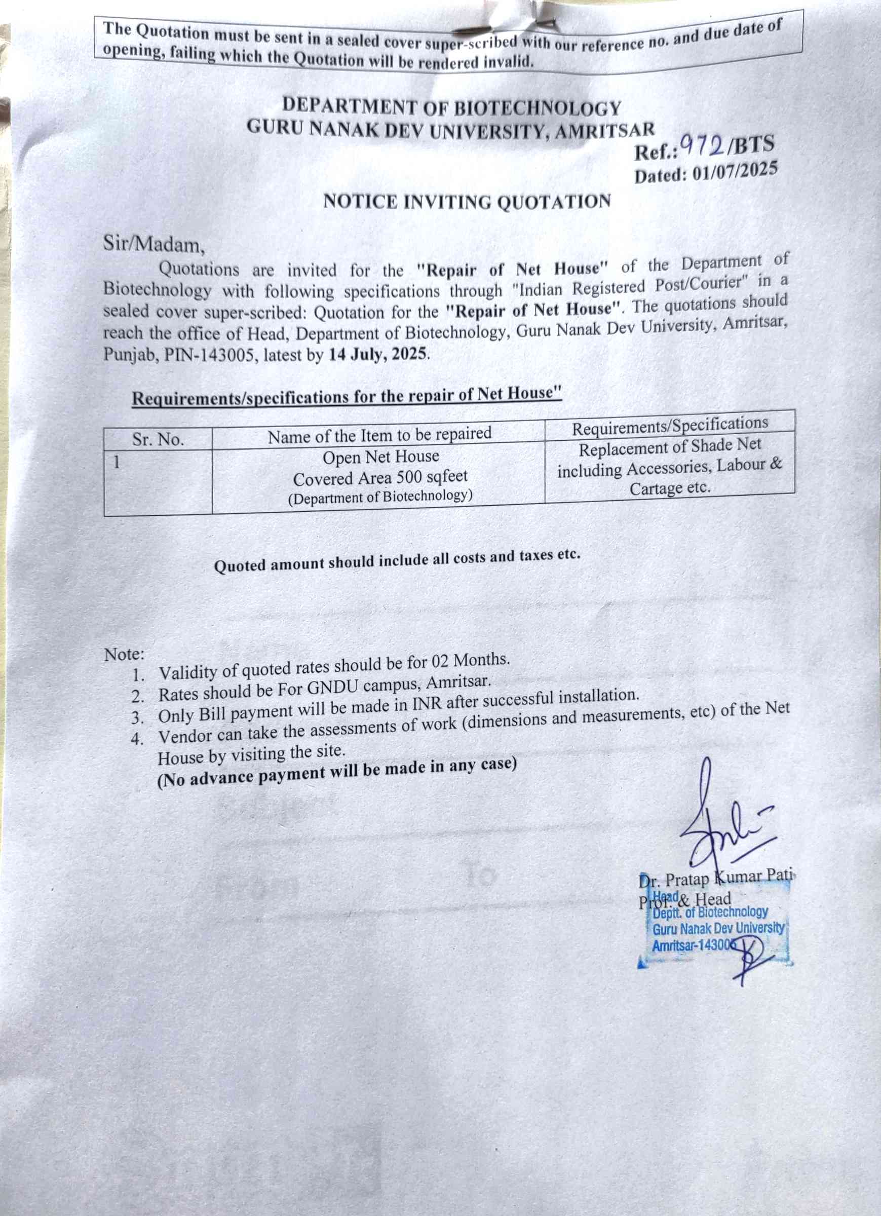 | Quotations are invited for repair of "UV-Spectrophotometer" in Department of Biotechnology, GNDU, Amritsar. |