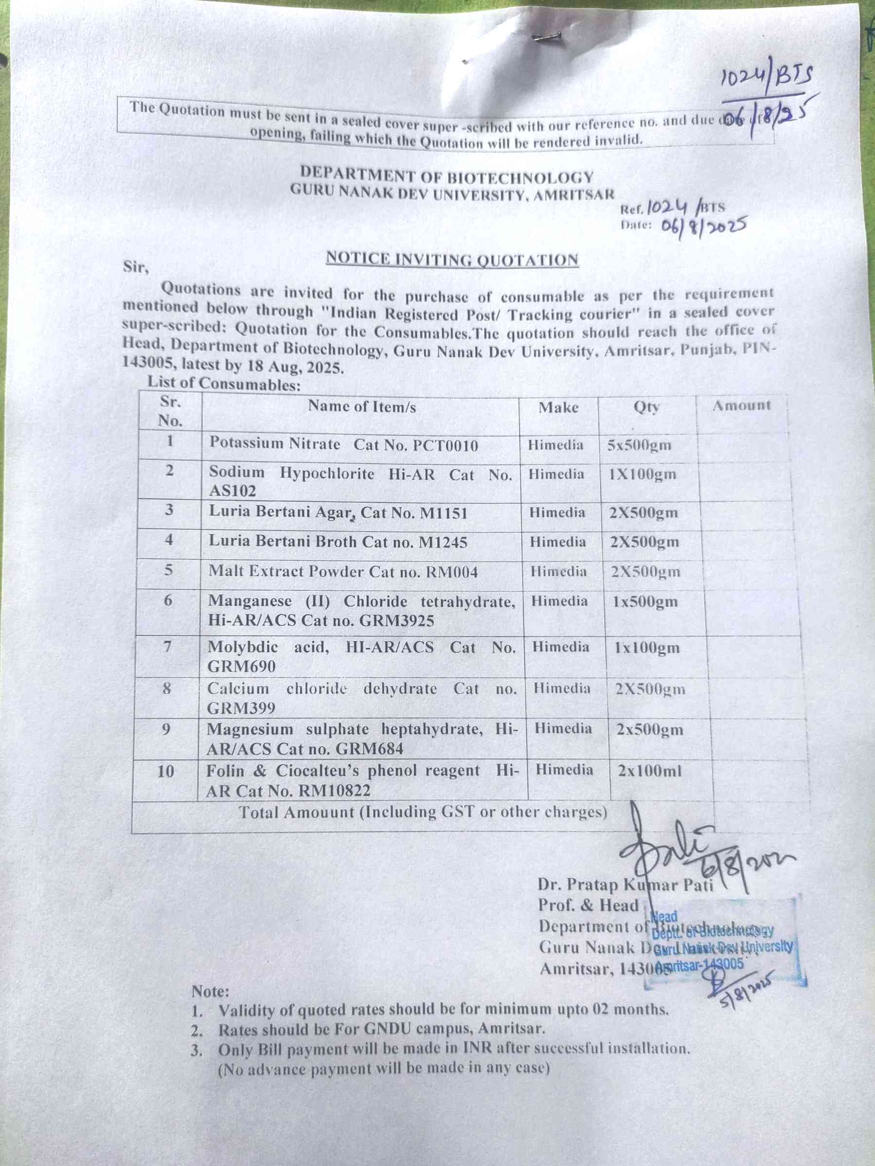 | Quotations are invited for the supply of Chemicals (SRL & Sigma) in the Deptt. of Biotechnology, GNDU, Amritsar. |