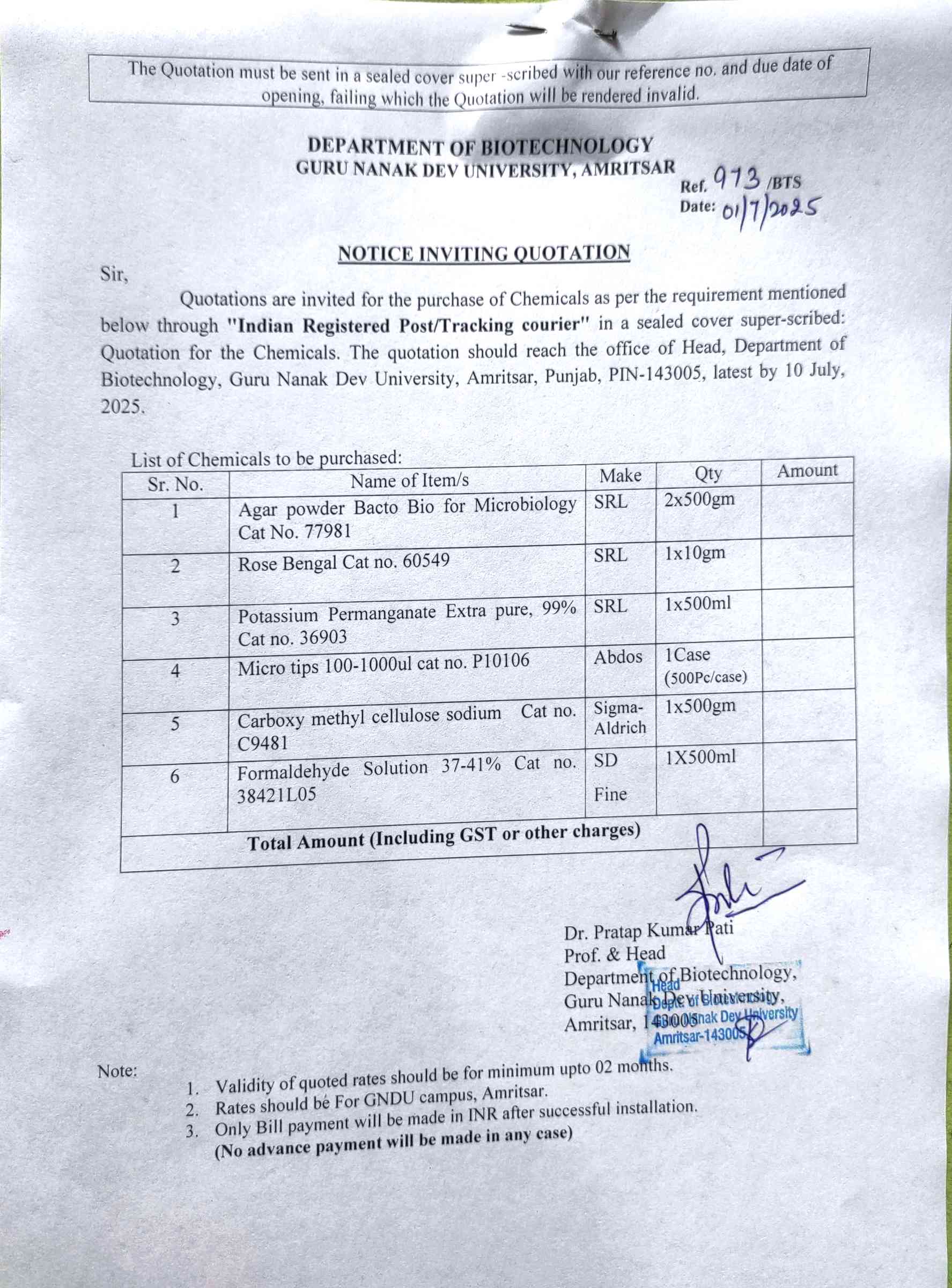 | Sealed quotations are invited for supply of Chemicals as per Given Specification in the Department of Biotechnology, GNDU, Amritsar. |