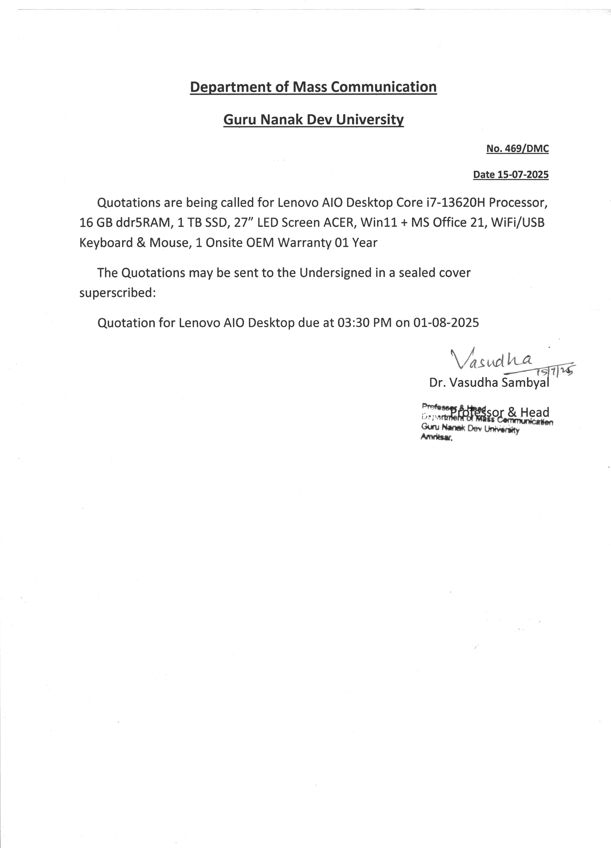 | Sealed quotations are invited for the Headphone, Condenser Microphone, Speaker on Studio floor+PCR , Teleprompter and TrackBall System in the Department of Mass Communication,GNDU, Amritsar. |