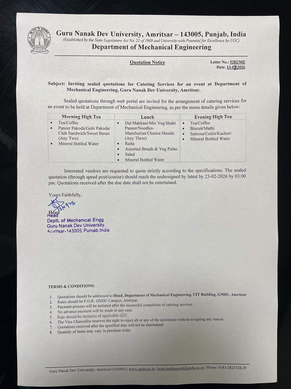 Sealed quotations are invited for Catering Services in the Department of Mechanical Engineering, GNDU, Amritsar. |