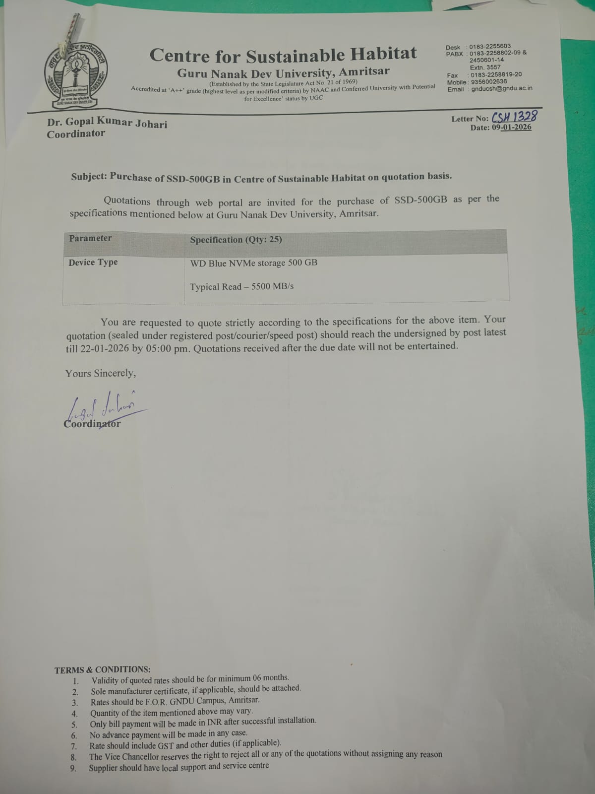 Sealed quotations are invited for the purchase of SSD-500 GB in the Centre of Sustainable Habitat, GNDU, Amritsar. |
