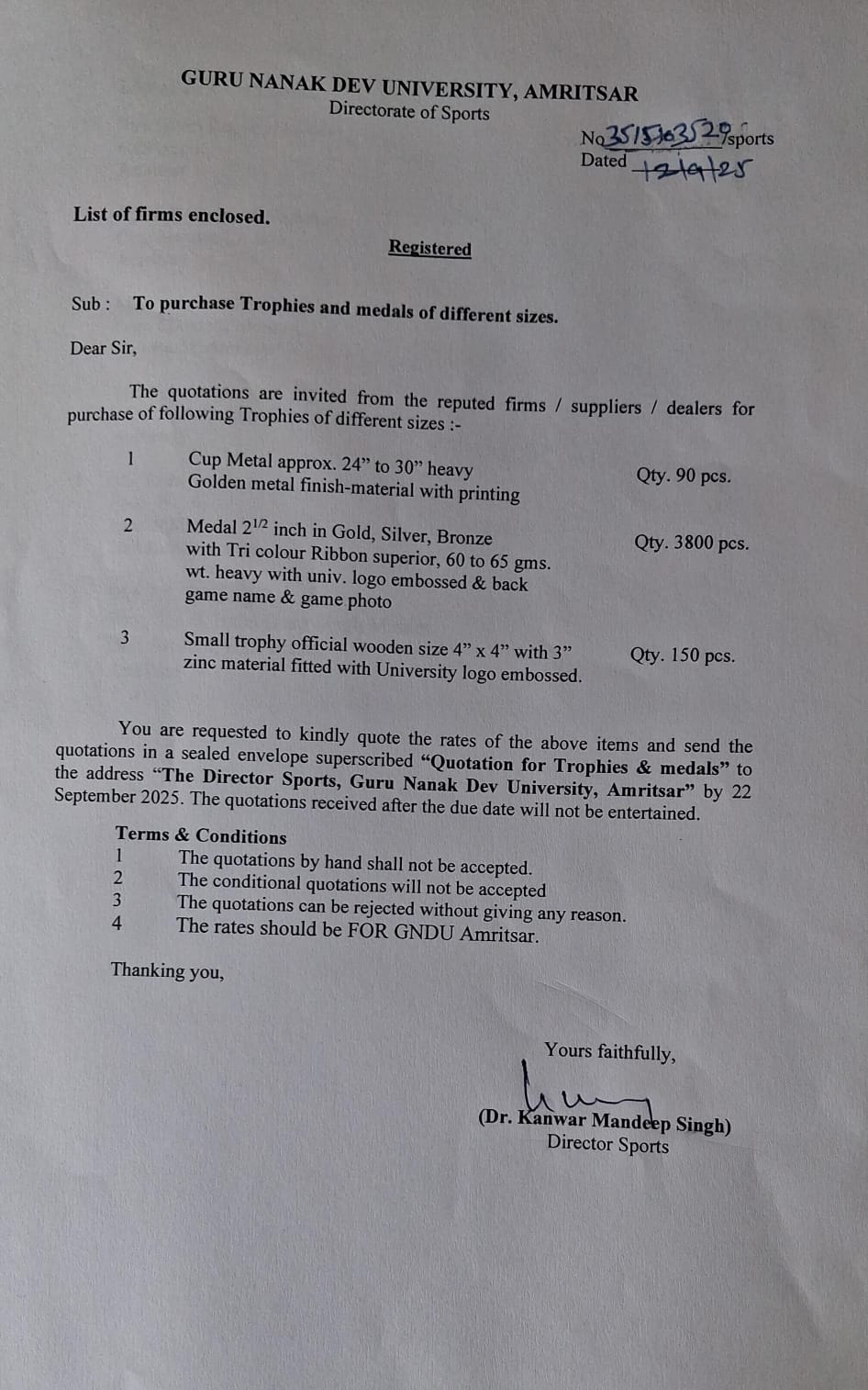 | Sealed quotations are invited for Photography/ Videography/ Live Streaming of various events organized by the GNDU, Amritsar. |