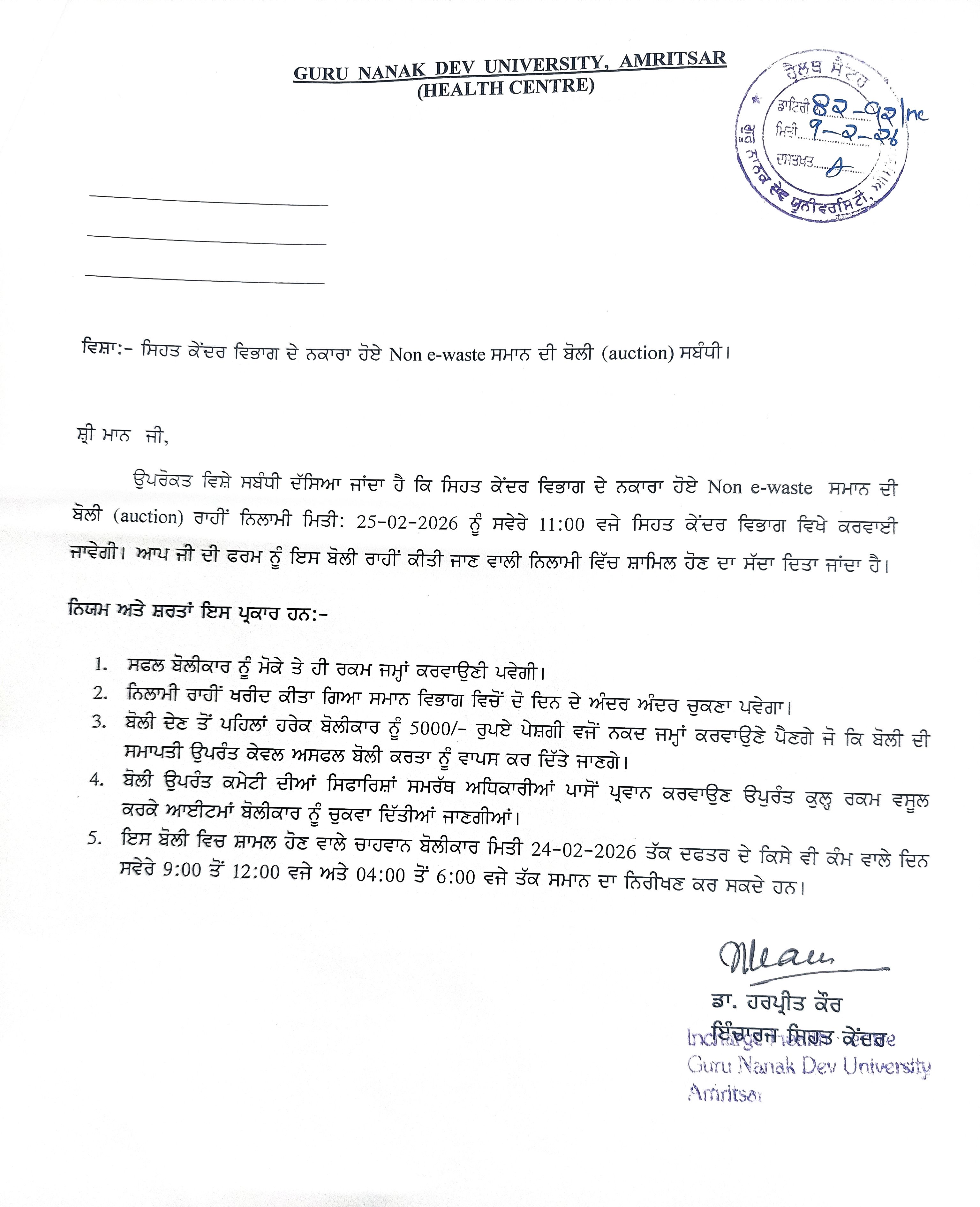 Sealed Quotation are invited for Regarding auction for Non E-waste material in the Health Centre, GNDU, Amritsar . |