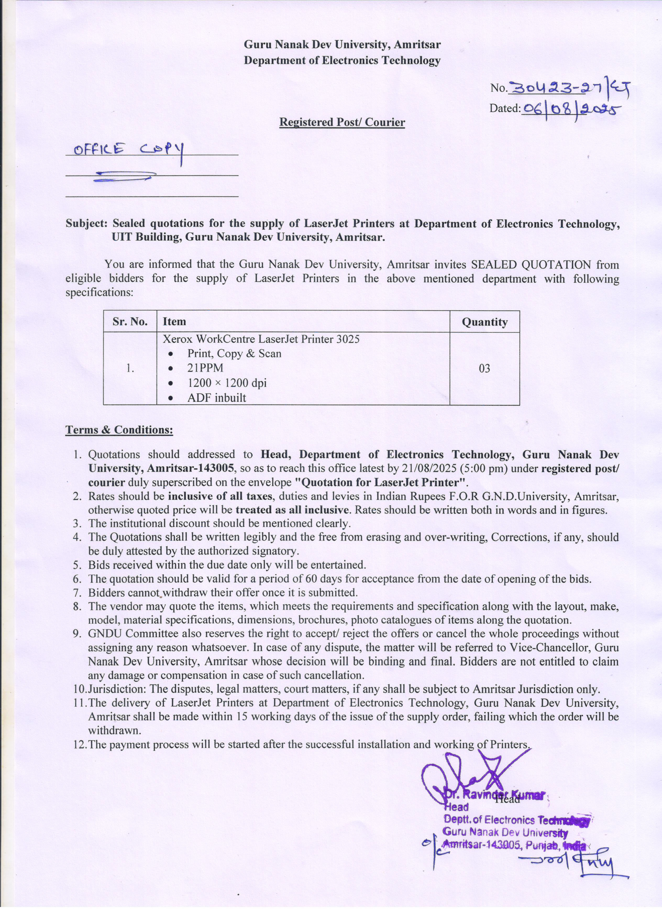 | Quotation for the supply of Printer, Digicam, External HDD, Pen Drive and Laptop at GNDU College Verka. |